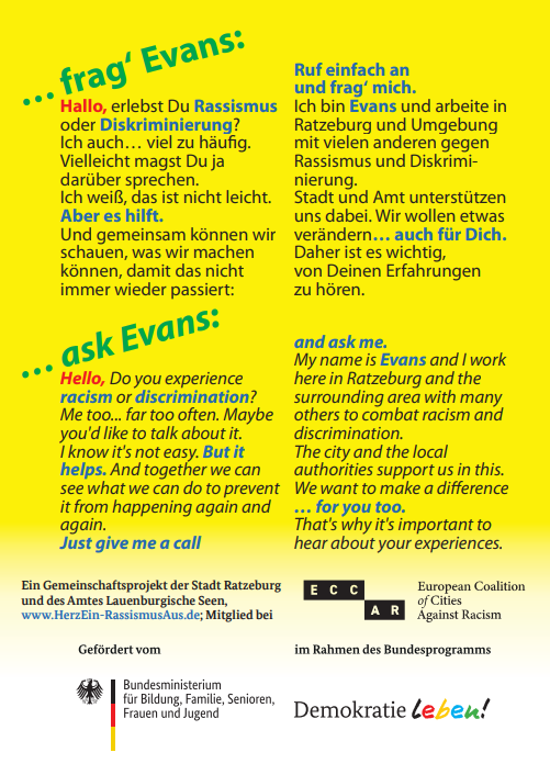 Die Workshops können unter herzein-rassismusaus@ratzeburg.de oder unter 0157-55901745 angefragt werden. Sie werden gefördert durch die ‚Partnerschaft für Demokratie‘ der Stadt Ratzeburg und des Amtes Lauenburgische Seen im Rahmen des Bundesprogramms ‚Demokratie leben!‘.